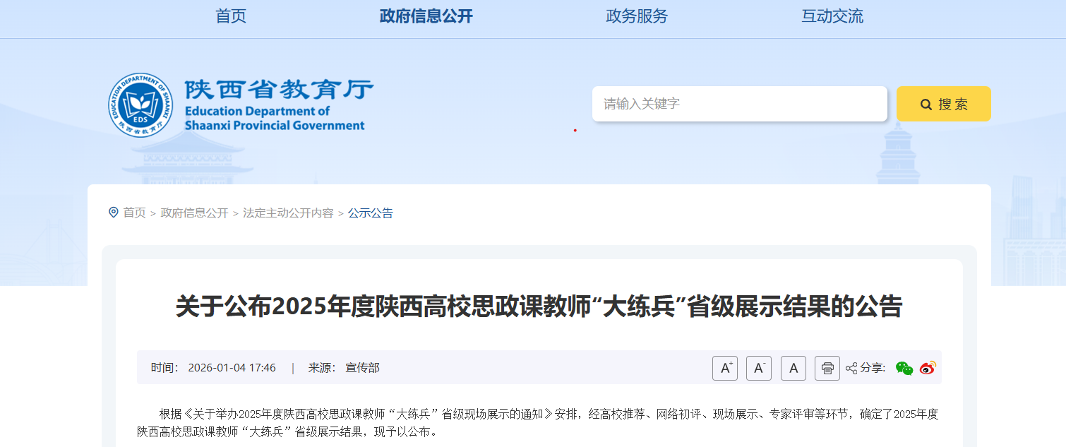 根据《关于举办2025年度陕西高校思政课教师“大练兵”省级现场展示的通知》安排,经高校推荐、网络初评、现场展示、专家评审等环节,确定了2025年度陕西高校思政课教师“大练兵”省级展示结果,郑璐院长、史晓华老师在2025年度陕西高校思政课教师“大练兵”省级展示中荣获一等奖。