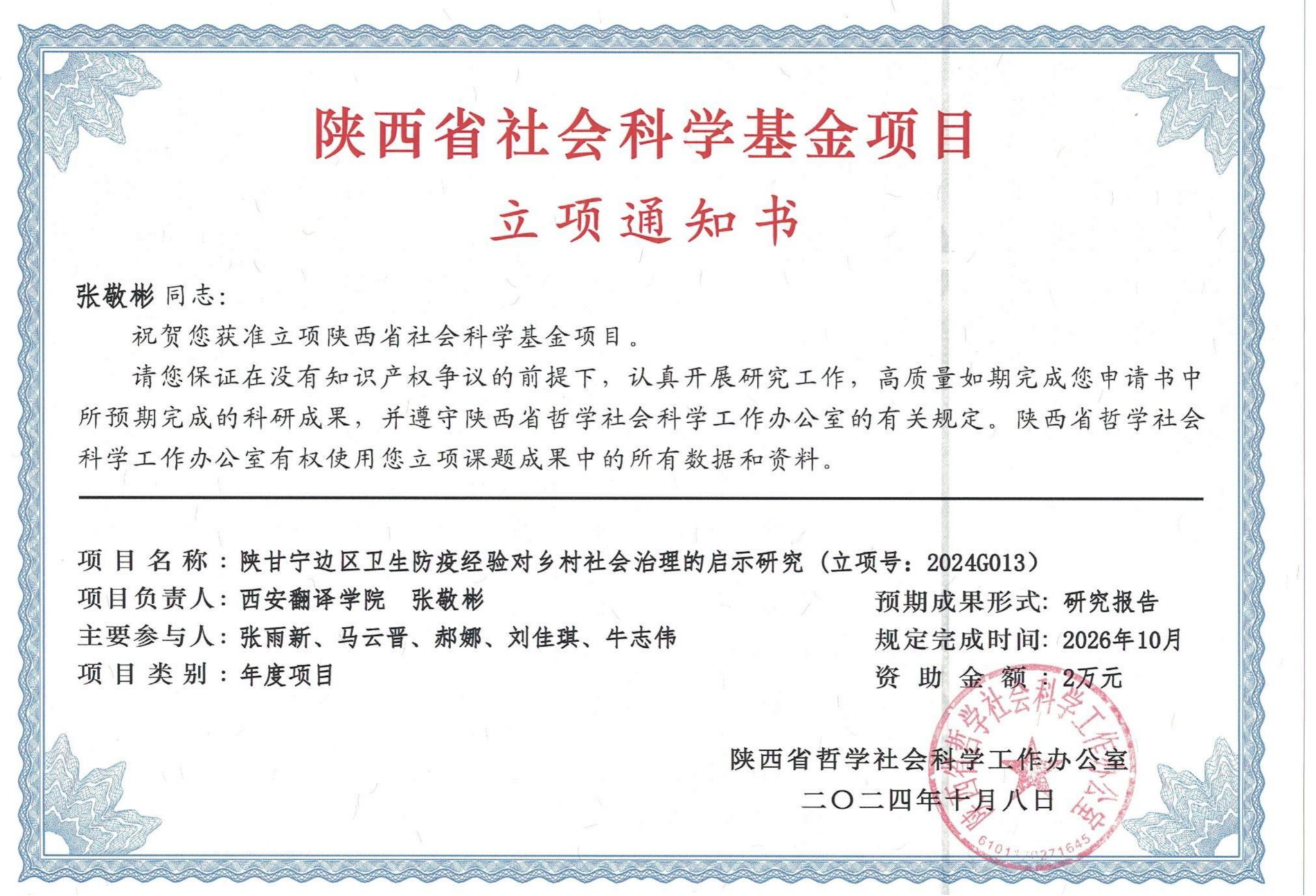 郑璐、张敬彬获批2024年陕西省社科基金项目